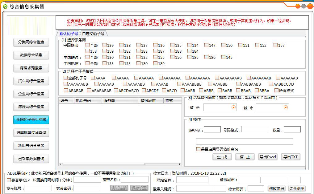 除了采集功能之外,软件还有自动过滤重复功能,号码归属地过滤功能,防限制采集设置功能(可以避免大部分情况下不被限制),自动ADLS拨号功能(拨号上网的客户才能使用),导出Excel文件功能,导出TXT文件功能,时间段筛选信息功能(此功能只限有“更新时间”段的信息才能使用),历史数据查询功能(只要采集过的信息,就能去“已搜索查询”中查询出来)。